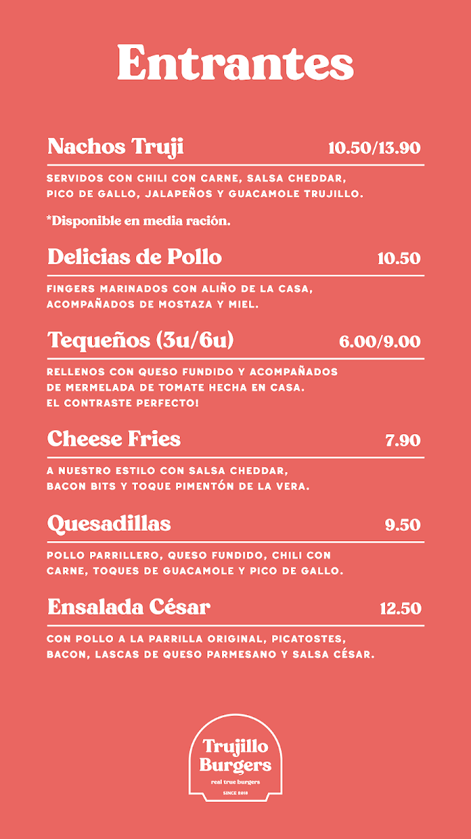 Welcome to Trujillo Burgers Estefanita, a delightful hamburger haven located in the heart of Villaverde, Madrid. Here, the art of burger-making takes center stage, showcasing an impressive menu that leaves diners craving for more. The Lady Pickle, with its silky brioche bun and premium beef blend, is a must-try, delivering a perfect balance of flavor thanks to its special sauce and crispy bacon. For those seeking something lighter, the Kikiriki Original offers a succulent grilled chicken breast with zesty guacamole. The Vegeta Classic and Vegan Burger cater to plant-based enthusiasts without compromising on taste. To satisfy any sweet tooth, their homemade cheesecakes, particularly the tangy Maracuyá, provide the perfect ending to your meal. With friendly service and a warm atmosphere, Trujillo Burgers Estefanita is not just a restaurant; it’s a memorable dining experience. Don’t miss out on this burger bliss!